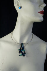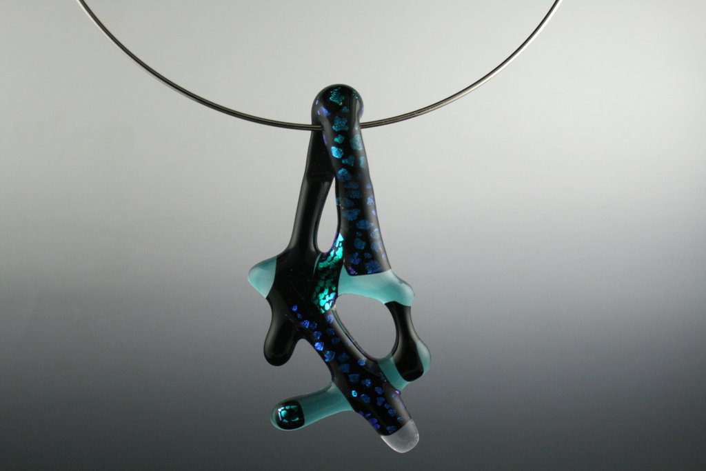 Dichroic (DIE-CROW-ICK) glass, discovered by bead makers in the early 1990’s, has rapidly become a favorite medium for glass artists. The material is valued for its ability to reflect intense light without producing a glare; it has been around for years, used widely in space industry, medical and photographic applications. For all its beauty and appeal it can be a touchy medium to conquer and an expensive one to experiment with. I enjoy the fusion of glass because it reflects the processes of integrating heat (the internal fire that creates the earth) and sand (where the ocean meets the earth). A powerful force capture in glass.