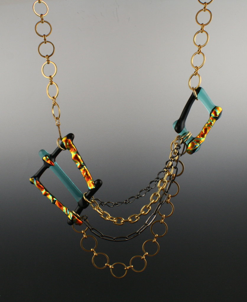 Dichroic (DIE-CROW-ICK) glass, discovered by bead makers in the early 1990’s, has rapidly become a favorite medium for glass artists. The material is valued for its ability to reflect intense light without producing a glare; it has been around for years, used widely in space industry, medical and photographic applications. For all its beauty and appeal it can be a touchy medium to conquer and an expensive one to experiment with. I enjoy the fusion of glass because it reflects the processes of integrating heat and sand (where the ocean meets the land). A powerful force capture in glass.
